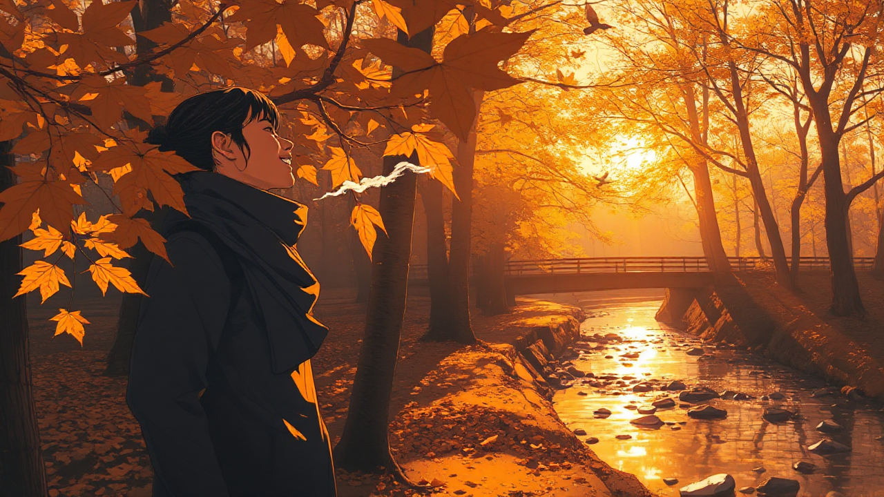 In the late afternoon hush, the year leans into gold. Light drifts like warm honey through thinning leaves, and the air carries a crisp, apple-bark fragrance that feels both familiar and new. A gentle breeze sifts through the trees, and somewhere, a distant laugh rings like a bell over water—small, bright, and true.